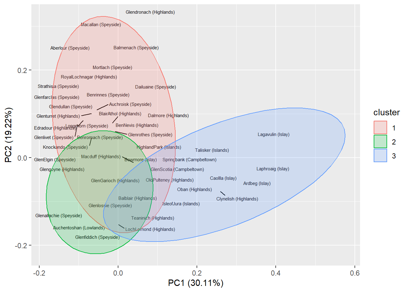 Die Analyse im DATA SCIENCE BLOG basiert auf nichtnormalisierten Daten und der Verwendung einer distanzoptimierenden PCA. In der folgenden Abbildung wird die Information über die Zugehörigkeit der 86 Destillerien zu den schottischen whiskey-Regionen zur Beschreibung mit dargestellt (geht nicht in die Berechnung ein: PCA ist eine Methode des unuspervised learnings).